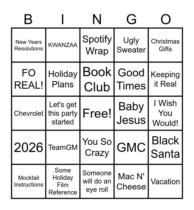 This bingo card has a free space and 25 words: TeamGM, Someone will do an eye roll, Book Club, Mocktail Instructions, Christmas Gifts, New Years Resolutions, FO REAL!, KWANZAA, Baby Jesus, You So Crazy, Good Times, Chevrolet, GMC, Black Santa, Holiday Plans, Straight Chillen, I Wish You Would!, Spotify Wrap, Keeping it Real, Let's get this party started, Vacation, Some Holiday Film Reference, 2026, Ugly Sweater and Mac N' Cheese.