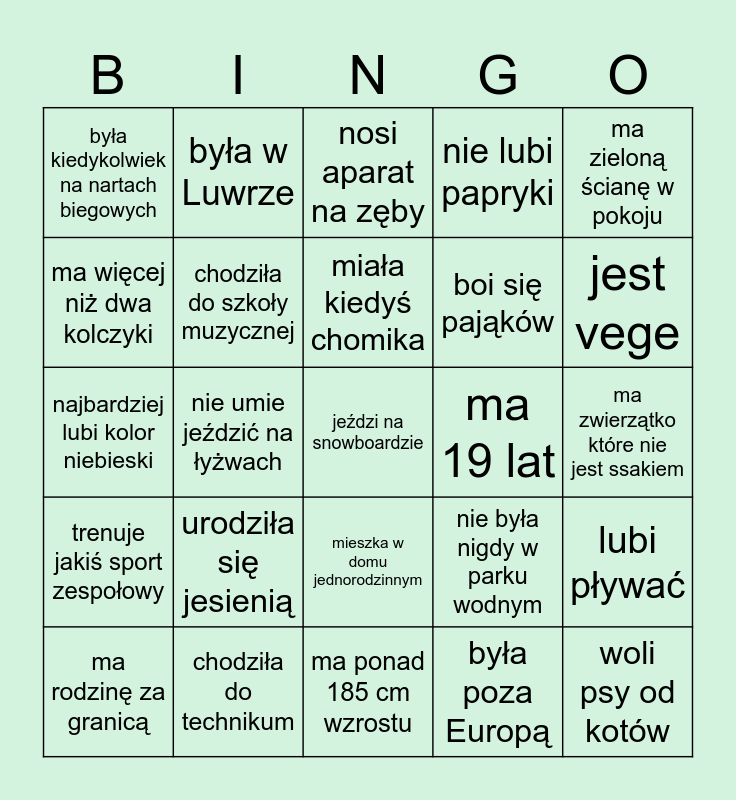 This bingo card has 25 words: urodziła się jesienią, ma ponad 185 cm wzrostu, miała kiedyś chomika, ma rodzinę za granicą, ma zieloną ścianę w pokoju, była kiedykolwiek na nartach biegowych, ma więcej niż dwa kolczyki, była w Luwrze, ma 19 lat, mieszka w domu jednorodzinnym, boi się pająków, najbardziej lubi kolor niebieski, nie była nigdy w parku wodnym, lubi pływać, chodziła do szkoły muzycznej, woli psy od kotów, ma zwierzątko które nie jest ssakiem, nosi aparat na zęby, jest vege, nie umie jeździć na łyżwach, jeździ na snowboardzie, chodziła do technikum, trenuje jakiś sport zespołowy, nie lubi papryki and była poza Europą.