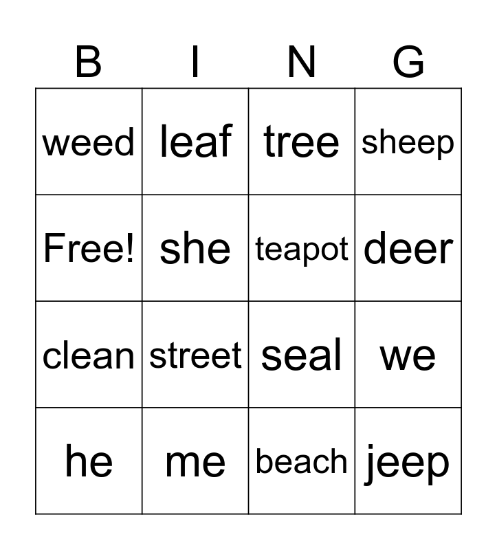 This bingo card has 16 words: me, we, tree, weed, clean, leaf, seal, beach, Free!, she, he, sheep, street, deer, teapot and jeep.