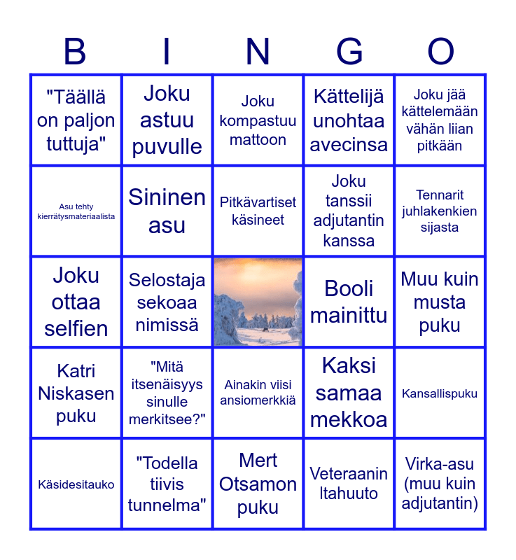 This bingo card has a free space and 24 words: "Mitä itsenäisyys sinulle merkitsee?", "Todella tiivis tunnelma", Pitkävartiset käsineet, Käsidesitauko, Joku jää kättelemään vähän liian pitkään, "Täällä on paljon tuttuja", Asu tehty kierrätysmateriaalista, Joku astuu puvulle, Booli mainittu, Ainakin viisi ansiomerkkiä, Joku tanssii adjutantin kanssa, Joku ottaa selfien, Kaksi samaa mekkoa, Kansallispuku, Sininen asu, Veteraanin ltahuuto, Muu kuin musta puku, Joku kompastuu mattoon, Tennarit juhlakenkien sijasta, Selostaja sekoaa nimissä, Virka-asu (muu kuin adjutantin), Katri Niskasen puku, Kättelijä unohtaa avecinsa and Mert Otsamon puku.