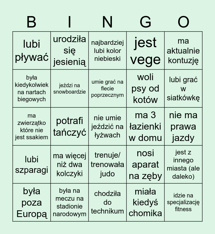 This bingo card has 50 words: chodziła do szkoły muzycznej, nie umie jeździć na łyżwach, słucha rapu, chodziła do technikum, ma więcej niż dwa kolczyki, woli zimę od lata, urodziła się jesienią, pracuje z dziećmi, była kiedykolwiek na nartach biegowych, boi się pająków, jeździ na snowboardzie, jest vege, jest z innego miasta (ale daleko), nosi aparat na zęby, ma więcej niż 2 rodzeństwa, ma rodzica, który jest lekarzem, umie grać na flecie poprzecznym, ma 3 łazienki w domu, trenuje/ trenowała zawodowo jakiś sport, ma aktualnie kontuzję, potrafi tańczyć, miała kiedyś chomika, lubi pływać, woli psy od kotów, urodziła się wiosną, idzie na specjalizację fitness, lubi grać w siatkówkę, oglądała mecz piłki nożnej w przeciągu ostatniego tygodnia, najbardziej lubi kolor niebieski, trenuje/ trenowała judo, nie lubi papryki, lubi nosić kolorowe skarpetki, nie była nigdy w parku wodnym, woli góry od morza, była na meczu na stadionie narodowym, ma 19 lat, nie pracuje, ma w pokoju więcej niż 3 rośliny, była w Luwrze, nie ma prawa jazdy, ma ponad 185 cm wzrostu, mieszka w domu jednorodzinnym, ma zieloną ścianę w pokoju, nie umie gwizdać, była poza Europą, ma zwierzątko które nie jest ssakiem, nie lubi pomidorów, ma rodzinę za granicą, lubi szparagi and była na nartach we Francji.