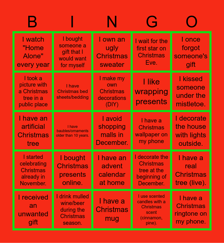 This bingo card has 25 words: I bought Christmas presents online., I have a Christmas mug, I make my own Christmas decorations (DIY), I received an unwanted gift, I once forgot someone's gift, I watch "Home Alone" every year, I took a picture with a Christmas tree in a public place, I bought someone a gift that I would want for myself, I have a Christmas wallpaper on my phone, I have an advent calendar at home, I like wrapping presents, I have an artificial Christmas tree, I decorate the Christmas tree at the beginning of December., I have a real Christmas tree (live)., I have Christmas bed sheets/bedding, I have a Christmas ringtone on my phone., I decorate the house with lights outside., I own an ugly Christmas sweater, I kissed someone under the mistletoe., I have baubles/ornaments older than 10 years., I avoid shopping malls in December., I drink mulled wine/beer during the Christmas season., I started celebrating Christmas already in November., I wait for the first star on Christmas Eve. and I use scented candles with a Christmas scent (cinnamon, pine)..