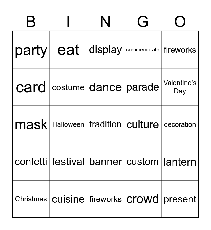 This bingo card has 25 words: festival, fireworks, dance, Christmas, fireworks, party, card, eat, culture, banner, parade, mask, custom, lantern, costume, present, decoration, display, Valentine's Day, Halloween, tradition, cuisine, confetti, commemorate and crowd.