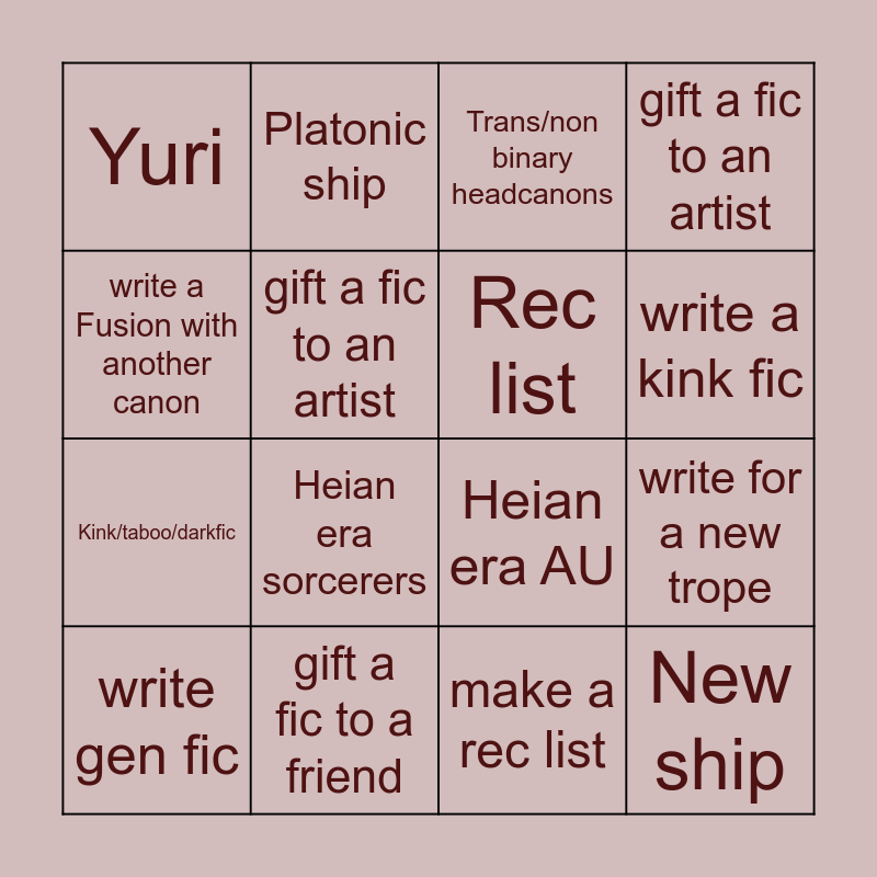This bingo card has 20 words: write for a new trope, write for an OT3, Trans/non binary headcanons, Rare Pair, write gen fic, write a Fusion with another canon, gift a fic to a friend, Yuri, Kink/taboo/darkfic, Platonic ship, Heian era sorcerers, Heian era AU, gift a fic to an artist, New ship, Rec list, Genderbend, write a kink fic, gift a fic to an artist, make a rec list and write for a new ship.