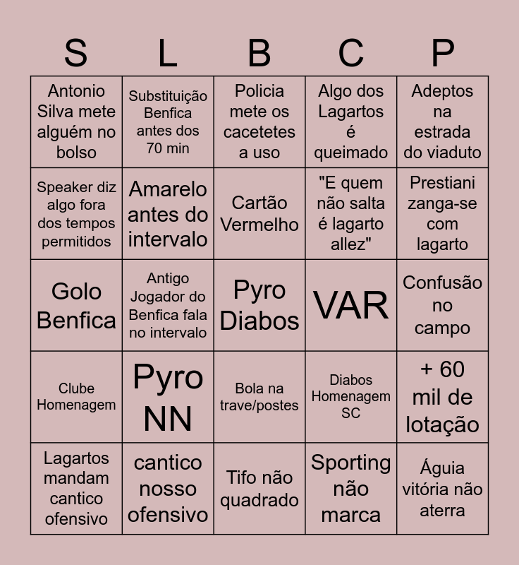This bingo card has a free space and 24 words: Pyro NN, cantico nosso ofensivo, Cartão Vermelho, Lagartos mandam cantico ofensivo, Adeptos na estrada do viaduto, Antonio Silva mete alguém no bolso, Speaker diz algo fora dos tempos permitidos, Substituição Benfica antes dos 70 min, VAR, Bola na trave/postes, "E quem não salta é lagarto allez", Golo Benfica, Diabos Homenagem SC, + 60 mil de lotação, Amarelo antes do intervalo, Sporting não marca, Confusão no campo, Policia mete os cacetetes a uso, Prestiani zanga-se com lagarto, Antigo Jogador do Benfica fala no intervalo, Águia vitória não aterra, Clube Homenagem, Algo dos Lagartos é queimado and Tifo não quadrado.