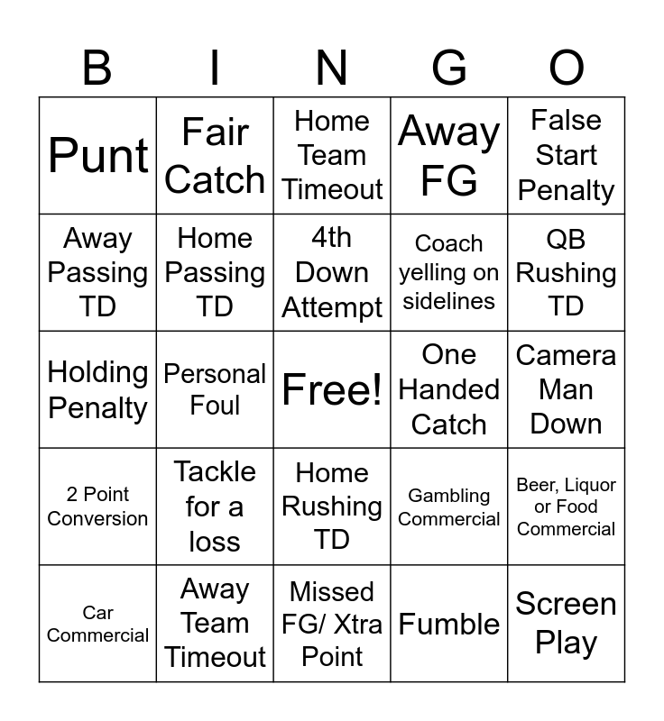 This bingo card has a free space and 35 words: QB Scramble for First Down, First TD (Either Team), Home FG, Home Passing TD, Home Rushing TD, Away FG, Away Passing TD, Away Rushing TD, 4th Down Attempt, INT, Holding Penalty, False Start Penalty, Challenge Flag, Touchback, Punt, One Handed Catch, Fumble, Personal Foul, 2 Point Conversion, Screen Play, Gambling Commercial, Car Commercial, Beer, Liquor or Food Commercial, Away Team Timeout, Home Team Timeout, QB Rushing TD, TD By Odd # Player, TD By Even # Player, Coach yelling on sidelines, Camera Man Down, TD Celebration, Missed FG/ Xtra Point, Tackle for a loss, Fair Catch and Defense or Special Teams TD.