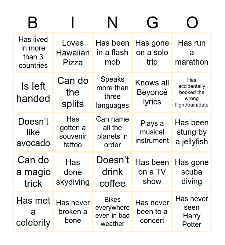 This bingo card has 25 words: Has done skydiving, Bikes everywhere even in bad weather, Speaks more than three languages, Has met a celebrity, Has run a marathon, Has lived in more than 3 countries, Is left handed, Loves Hawaiian Pizza, Plays a musical instrument, Doesn’t drink coffee, Knows all Beyoncé lyrics, Doesn’t like avocado, Has been on a TV show, Has gone scuba diving, Can do the splits, Has never seen Harry Potter, Has been stung by a jellyfish, Has been in a flash mob, Has accidentally booked the wrong flight/train/date, Has gotten a souvenir tattoo, Can name all the planets in order, Has never broken a bone, Can do a magic trick, Has gone on a solo trip and Has never been to a concert.