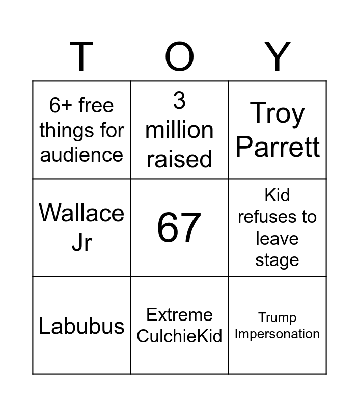 This bingo card has a free space and 8 words: Kid refuses to leave stage, Troy Parrett, 3 million raised, Labubus, 6+ free things for audience, Trump Impersonation, Wallace Jr and Extreme CulchieKid.