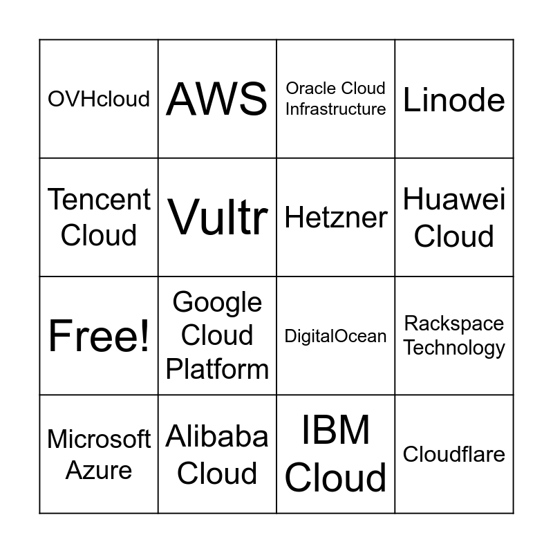 This bingo card has 16 words: Alibaba Cloud, Rackspace Technology, Oracle Cloud Infrastructure, OVHcloud, Free!, AWS, DigitalOcean, IBM Cloud, Tencent Cloud, Vultr, Microsoft Azure, Linode, Google Cloud Platform, Huawei Cloud, Hetzner and Cloudflare.
