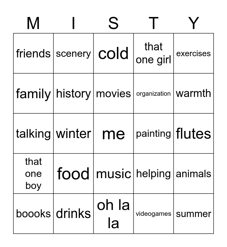 This bingo card has a free space and 24 words: food, drinks, movies, boooks, exercises, friends, family, scenery, painting, music, organization, talking, helping, animals, history, videogames, flutes, cold, warmth, winter, summer, that one boy, that one girl and oh la la.