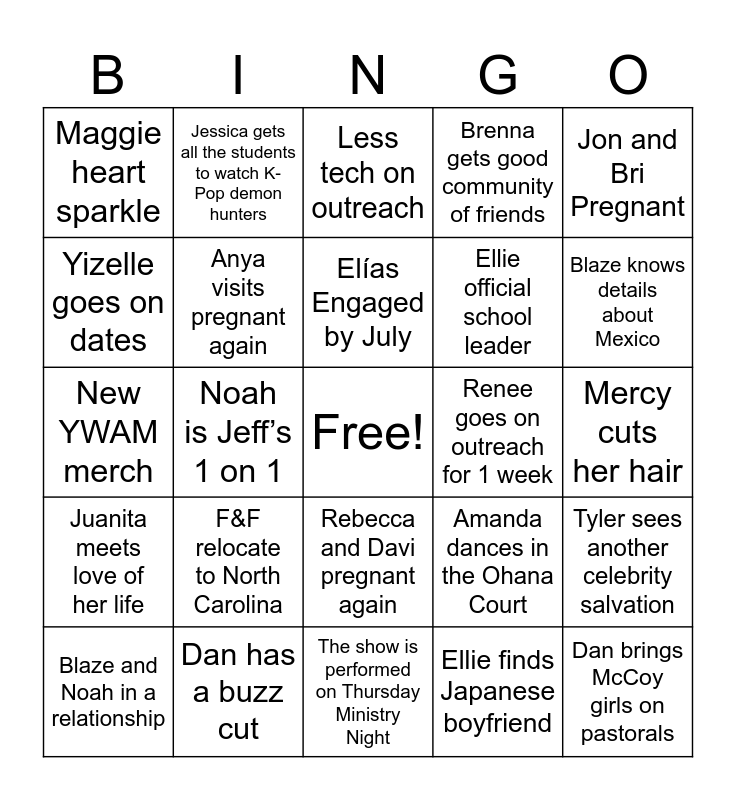 This bingo card has a free space and 24 words: F&F relocate to North Carolina, Dan has a buzz cut, Elías Engaged by July, Blaze and Noah in a relationship, Jon and Bri Pregnant, Maggie heart sparkle, Yizelle goes on dates, Jessica gets all the students to watch K-Pop demon hunters, Renee goes on outreach for 1 week, Rebecca and Davi pregnant again, Ellie official school leader, New YWAM merch, Amanda dances in the Ohana Court, Tyler sees another celebrity salvation, Anya visits pregnant again, Ellie finds Japanese boyfriend, Mercy cuts her hair, Less tech on outreach, Blaze knows details about Mexico, Noah is Jeff’s 1 on 1, Dan brings McCoy girls on pastorals, Juanita meets love of her life, Brenna gets good community of friends and The show is performed on Thursday Ministry Night.