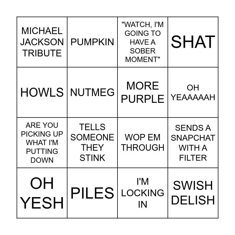 This bingo card has 16 words: PILES, SENDS A SNAPCHAT WITH A FILTER, "WATCH, I'M GOING TO HAVE A SOBER MOMENT", MICHAEL JACKSON TRIBUTE, ARE YOU PICKING UP WHAT I'M PUTTING DOWN, PUMPKIN, WOP EM THROUGH, I'M LOCKING IN, HOWLS, NUTMEG, OH YESH, SHAT, TELLS SOMEONE THEY STINK, OH YEAAAAAH, MORE PURPLE and SWISH DELISH.
