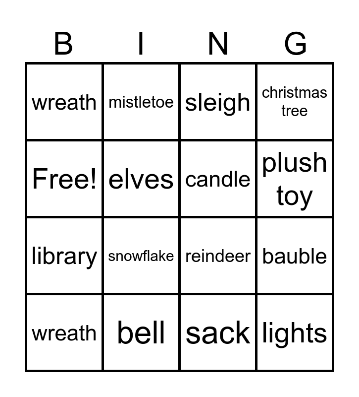 This bingo card has 16 words: bell, bauble, sleigh, wreath, library, mistletoe, reindeer, sack, Free!, elves, wreath, christmas tree, snowflake, plush toy, candle and lights.