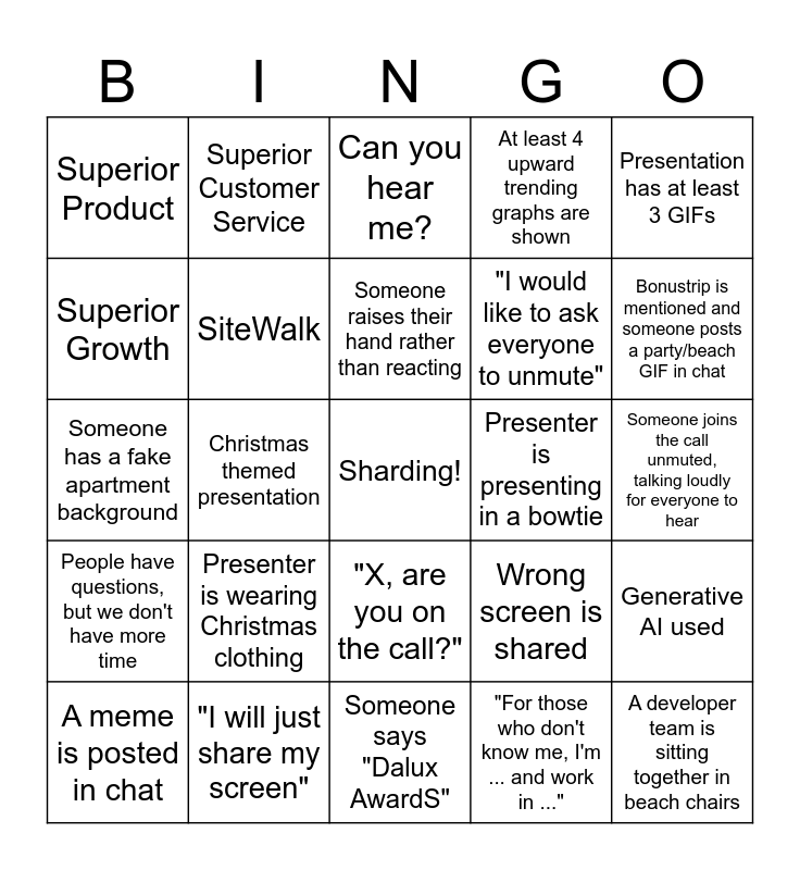 This bingo card has a free space and 24 words: Presenter is wearing Christmas clothing, "I will just share my screen", Someone raises their hand rather than reacting, A meme is posted in chat, Presentation has at least 3 GIFs, Superior Product, Superior Growth, Superior Customer Service, Presenter is presenting in a bowtie, "X, are you on the call?", "I would like to ask everyone to unmute", Someone has a fake apartment background, Wrong screen is shared, Generative AI used, SiteWalk, "For those who don't know me, I'm ... and work in ...", Someone joins the call unmuted, talking loudly for everyone to hear, Can you hear me?, Bonustrip is mentioned and someone posts a party/beach GIF in chat, Christmas themed presentation, A developer team is sitting together in beach chairs, People have questions, but we don't have more time, At least 4 upward trending graphs are shown and Someone says "Dalux AwardS".