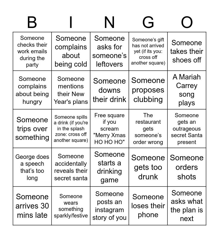 This bingo card has a free space and 24 words: Someone accidentally reveals their secret santa, Someone wears something sparkly/festive, Someone downs their drink, Someone arrives 30 mins late, Someone takes their shoes off, Someone checks their work emails during the party, Someone complains about being hungry, Someone complains about being cold, The restaurant gets someone’s order wrong, Someone starts a drinking game, Someone proposes clubbing, Someone trips over something, Someone gets too drunk, Someone orders shots, Someone mentions their New Year's plans, Someone loses their phone, Someone gets an outrageous secret Santa present, Someone asks for someone’s leftovers, A Mariah Carrey song plays, Someone spills a drink (if you're in the splash zone: cross off another square), Someone asks what the plan is next, George does a speech that’s too long, Someone’s gift has not arrived yet (if its you: cross off another square) and Someone posts an instagram story of you.