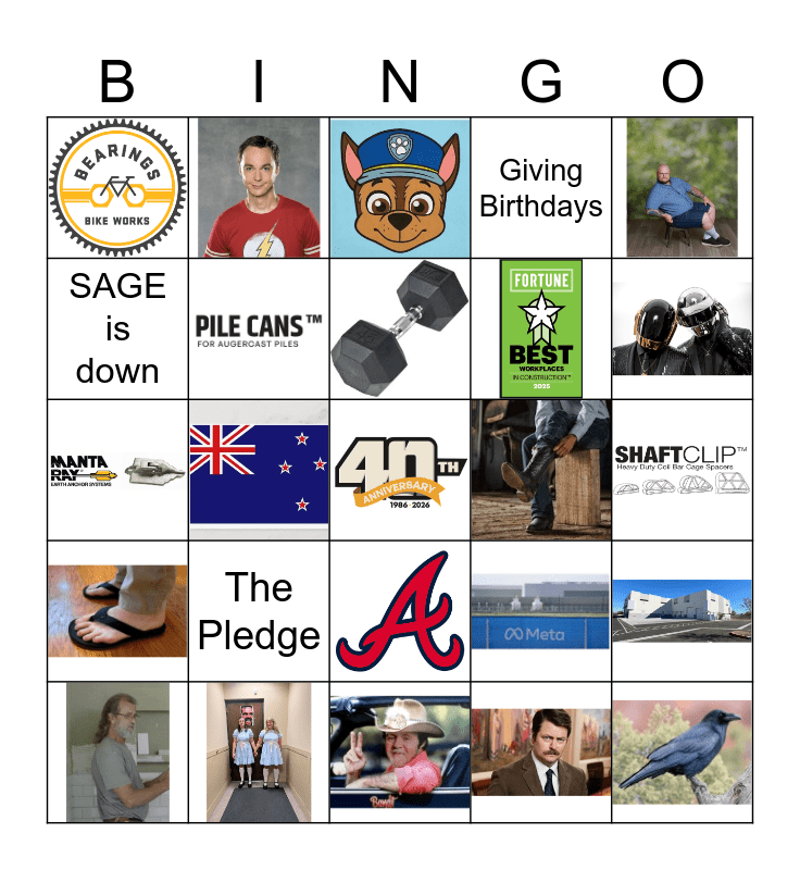 This bingo card has 21 images, a free space and 3 words: The Pledge, SAGE is down and Giving Birthdays.