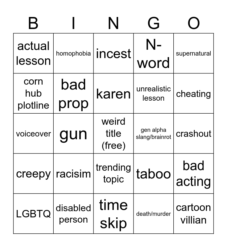This bingo card has a free space and 24 words: racisim, disabled person, karen, LGBTQ, supernatural, actual lesson, corn hub plotline, homophobia, gen alpha slang/brainrot, trending topic, unrealistic lesson, voiceover, taboo, bad acting, bad prop, death/murder, crashout, incest, cheating, gun, cartoon villian, creepy, N-word and time skip.