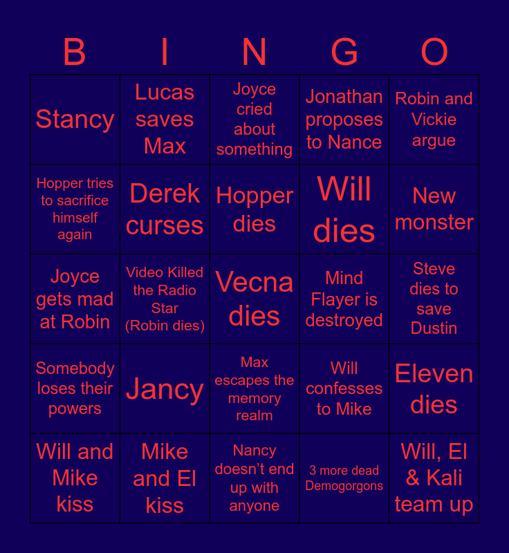 This bingo card has a free space and 24 words: Will and Mike kiss, Jancy, Hopper dies, 3 more dead Demogorgons, Robin and Vickie argue, Stancy, Lucas saves Max, Joyce cried about something, Mind Flayer is destroyed, Steve dies to save Dustin, Joyce gets mad at Robin, Derek curses, Will confesses to Mike, Eleven dies, Hopper tries to sacrifice himself again, Mike and El kiss, Nancy doesn’t end up with anyone, Jonathan proposes to Nance, New monster, Somebody loses their powers, Video Killed the Radio Star (Robin dies), Max escapes the memory realm, Will dies and Will, El & Kali team up.