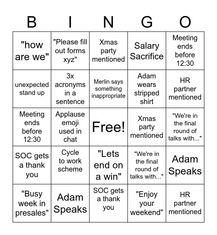 This bingo card has a free space and 47 words: technical difficulties (talking while mute), HR partner mentioned, "Busy week in presales", SOC gets a thank you, Cycle to work scheme, "Lets end on a win", "Please fill out forms xyz", "Busy week in the SOC", unexpected stand up, "KnowBe4 training", 3x acronyms in a sentence, Salary Sacrifice, Adam Speaks, "We're in the final round of talks with...", New client name drop, "Development Pipeline", Merlin says something inappropriate, Xmas party mentioned, "Camera's on please", Meeting ends before 12:30, Applause emoji used in chat, "Enjoy your weekend", "how are we", Adam wears stripped shirt, technical difficulties (talking while mute), HR partner mentioned, "Busy week in presales", Cycle to work scheme, "Lets end on a win", SOC gets a thank you, "Please fill out forms xyz", unexpected stand up, "KnowBe4 training", 3x acronyms in a sentence, Salary Sacrifice, Adam Speaks, "We're in the final round of talks with...", New client name drop, "Development Pipeline", Merlin says something inappropriate, "Camera's on please", Xmas party mentioned, Meeting ends before 12:30, Applause emoji used in chat, "Enjoy your weekend", "how are we" and Adam wears stripped shirt.