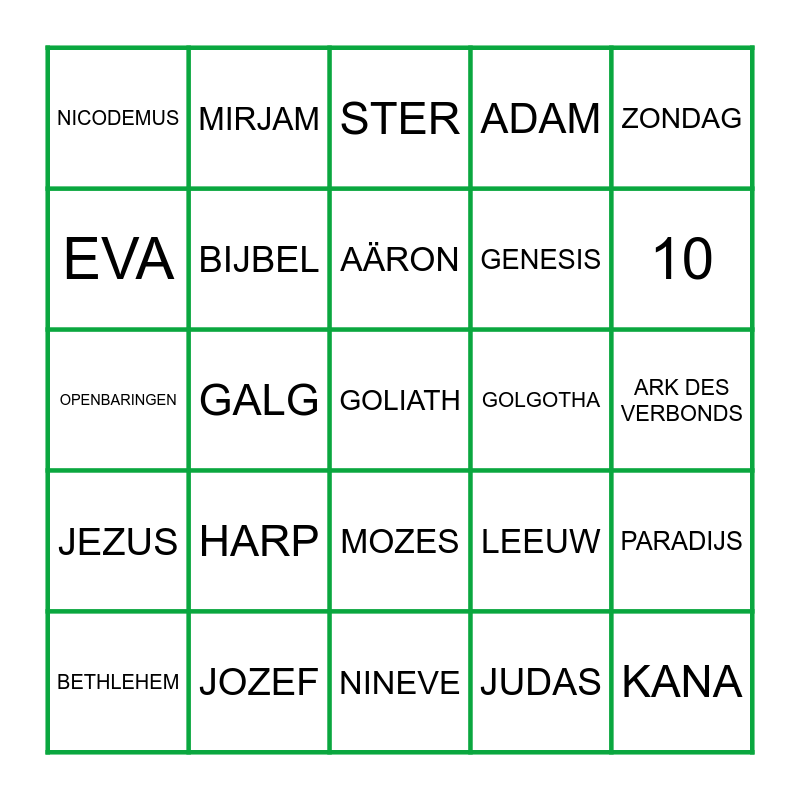 This bingo card has a free space and 54 words: JONA, JEZUS, PETRUS, PILATUS, MOZES, NOACH, ADAM, DANIEL, EVA, ZACHEÜS, NICODEMUS, MARIA, JOZEF, BETHLEHEM, NAZARETH, NINEVE, KANA, GENESIS, 2 STENEN TAFELEN, ARK DES VERBONDS, LEEUW, PSALMEN, GOLGOTHA, ZONDAG, KERST, MIRJAM, RUTH, Boaz, 12, JUDAS, KAÏN, SARAÏ, DUIVEL, OLIE, STER, BEREN, OPENBARINGEN, PARADIJS, LAM, BIJBEL, APPEL, BENJAMIN, KRUIS, JOHANNES, HARP, Jakob, ELIA, REGENBOOG, AÄRON, GALG, 10, HAREN, EZEL and 3.