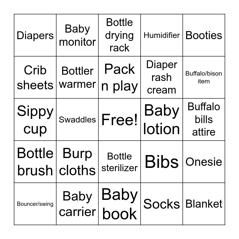 This bingo card has a free space and 42 words: Car seat, Pack n play, Washcloths, Burp cloths, Socks, Onesie, Blanket, Bottle, Bottle drying rack, Bottle sterilizer, Buffalo bills attire, Buffalo/bison item, Swaddles, Booties, High chair, Bibs, Spoons, Sippy cup, Diaper bag, Baby monitor, Crib sheets, Teether, Changing pad, Diapers, Baby wipes, Pacifier, Diaper rash cream, Baby bath tub, Bathing toys, Tummy time mat, Rattle, Bottle brush, Bottler warmer, Baby book, Baby first aid, Bouncer/swing, Baby carrier, Baby lotion, Baby shampoo, Stuffed animal, Humidifier and Clothing set.