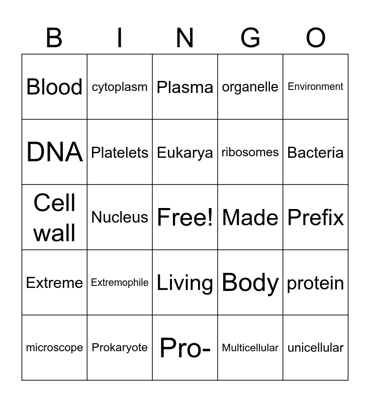 This bingo card has a free space and 30 words: Prokaryote, Eukarote, Nucleus, Cell, Blood, Plasma, Platelets, Living, Made, Pro-, Prefix, unicellular, Multicellular, Archae, Bacteria, Domain, Body, Extreme, Extremophile, Environment, Cell wall, cell membrane, cytoplasm, ribosomes, DNA, organelle, protein, microscope, Eukarya and Genetic.