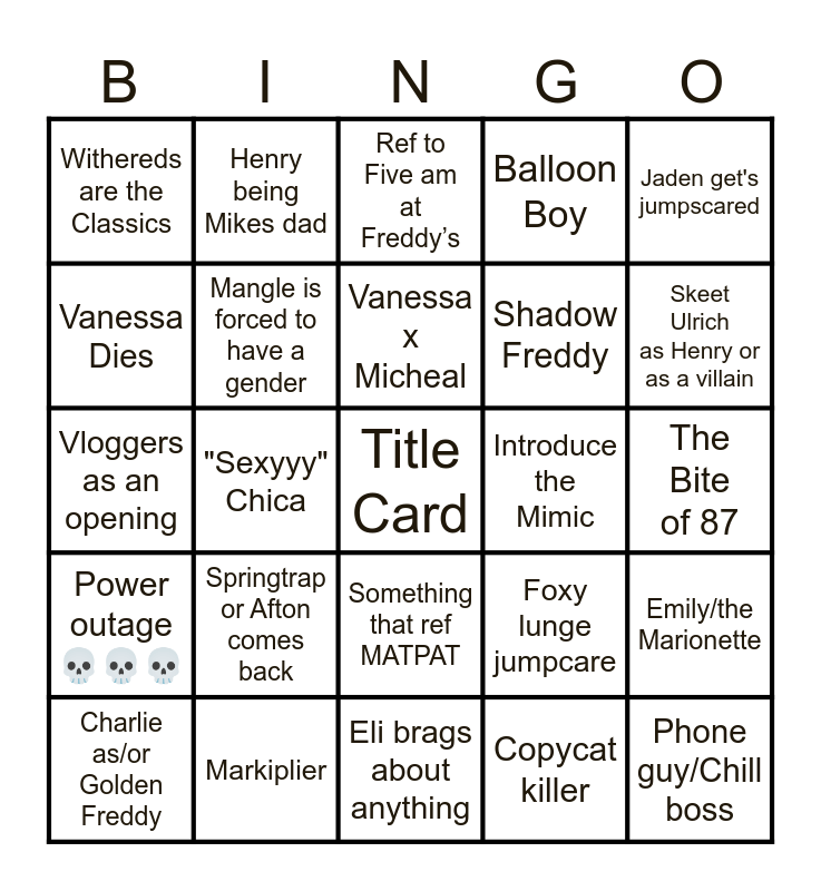 This bingo card has a free space and 24 words: Springtrap or Afton comes back, Markiplier, Vanessa x Micheal, Charlie as/or Golden Freddy, Jaden get's jumpscared, Withereds are the Classics, Vanessa Dies, Henry being Mikes dad, Introduce the Mimic, Something that ref MATPAT, Shadow Freddy, Vloggers as an opening, Foxy lunge jumpcare, Emily/the Marionette, Mangle is forced to have a gender, Copycat killer, The Bite of 87, Ref to Five am at Freddyโs, Skeet Ulrich as Henry or as a villain, "Sexyyy" Chica, Phone guy/Chill boss, Power outage ๐๐๐, Balloon Boy and Eli brags about anything.
