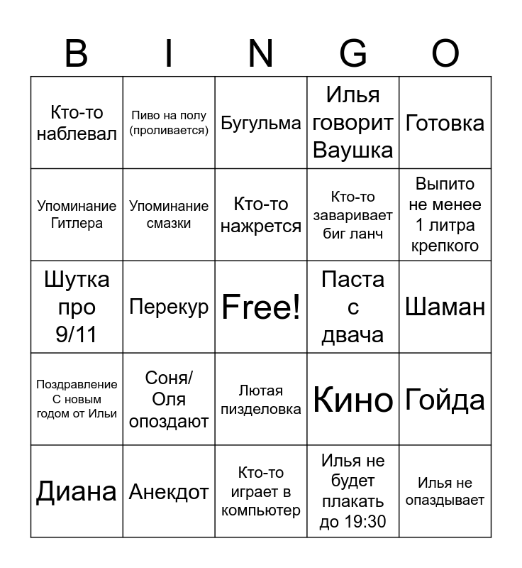 This bingo card has a free space and 24 words: Диана, Соня/Оля опоздают, Кто-то нажрется, Илья не будет плакать до 19:30, Готовка, Кто-то наблевал, Пиво на полу (проливается), Бугульма, Паста с двача, Шаман, Шутка про 9/11, Упоминание смазки, Кино, Гойда, Упоминание Гитлера, Анекдот, Кто-то играет в компьютер, Илья говорит Ваушка, Выпито не менее 1 литра крепкого, Поздравление С новым годом от Ильи, Перекур, Лютая пизделовка, Кто-то заваривает биг ланч and Илья не опаздывает.