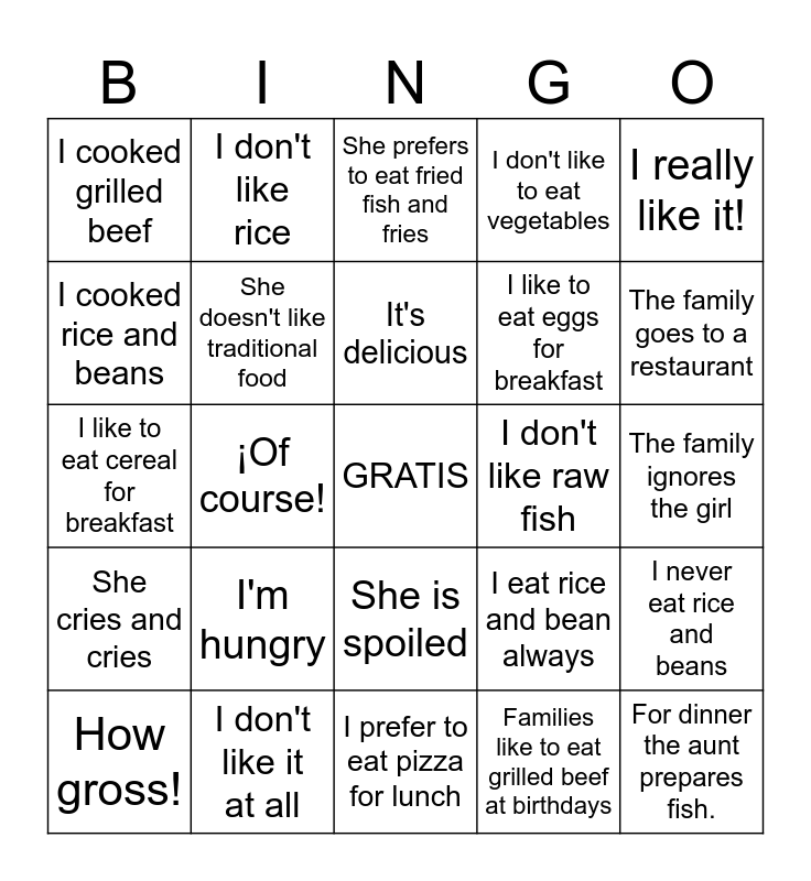 This bingo card has a free space and 24 words: I'm hungry, I don't like it at all, It's delicious, How gross!, I really like it!, I cooked grilled beef, I cooked rice and beans, I don't like rice, I don't like raw fish, She is spoiled, I like to eat eggs for breakfast, I like to eat cereal for breakfast, I eat rice and bean always, I never eat rice and beans, She doesn't like traditional food, Families like to eat grilled beef at birthdays, The family ignores the girl, She prefers to eat fried fish and fries, The family goes to a restaurant, ¡Of course!, For dinner the aunt prepares fish., She cries and cries, I don't like to eat vegetables and I prefer to eat pizza for lunch.