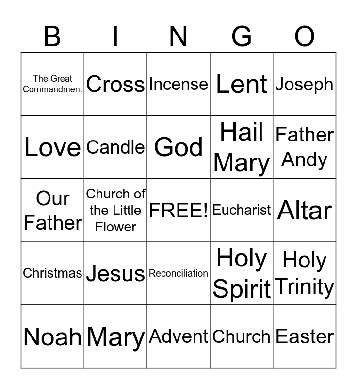 This bingo card has a free space and 24 words: Jesus, Mary, God, Noah, Joseph, The Great Commandment, Love, Cross, Eucharist, Reconciliation, Hail Mary, Our Father, Holy Spirit, Holy Trinity, Candle, Church, Altar, Incense, Father Andy, Church of the Little Flower, Easter, Christmas, Lent and Advent.