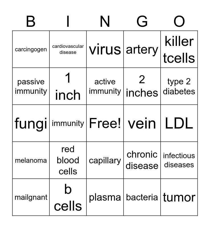 This bingo card has a free space and 44 words: cancer, tumor, benign, mailgnant, metastasis, bacteria, virus, inflammatory response, killer tcells, b cells, artery, vein, capillary, red blood cells, white blood cells, plasma, platelet, fungi, type 1 diabetes, type 2 diabetes, cardiovascular disease, hypertension, plaque, carcingogen, HDL, LDL, Heart attack, stroke, chronic disease, melanoma, pathogens, infectious diseases, pandemic, epidemic, immunity, lymphatic system, nervous system, circulatory system, active immunity, passive immunity, 2 inches, 3 inches, 1 inch and arrhythmia.