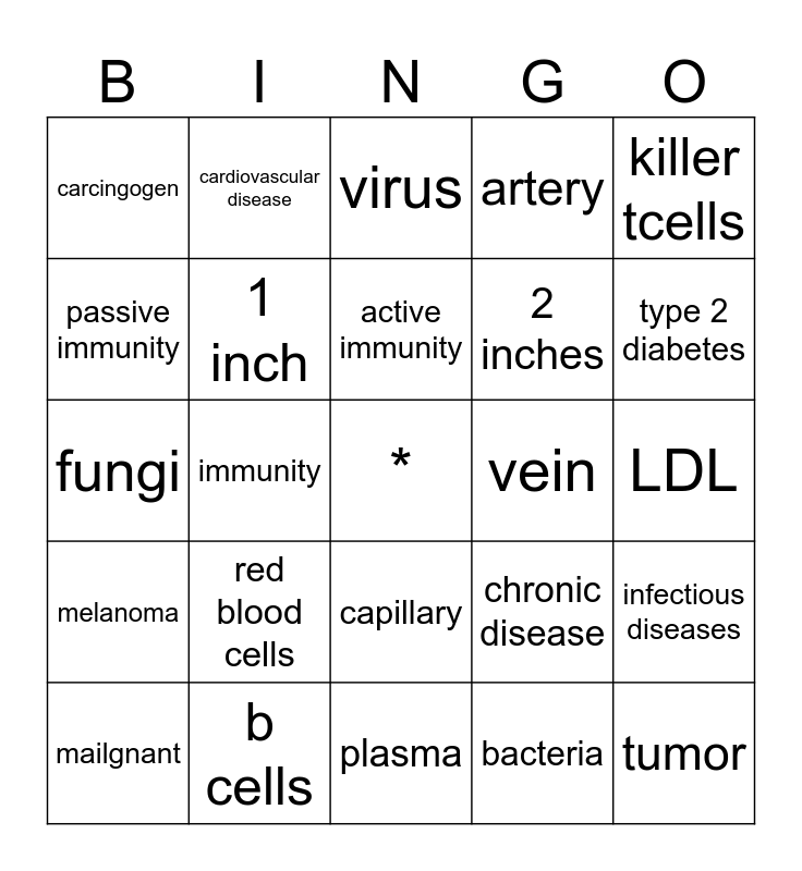 This bingo card has a free space and 44 words: cancer, tumor, benign, mailgnant, metastasis, bacteria, virus, inflammatory response, killer tcells, b cells, artery, vein, capillary, red blood cells, white blood cells, plasma, platelet, fungi, type 1 diabetes, type 2 diabetes, cardiovascular disease, hypertension, plaque, carcingogen, HDL, LDL, Heart attack, stroke, chronic disease, melanoma, pathogens, infectious diseases, pandemic, epidemic, immunity, lymphatic system, nervous system, circulatory system, active immunity, passive immunity, 2 inches, 3 inches, 1 inch and arrhythmia.