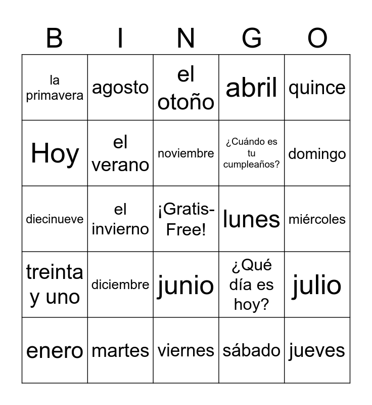 This bingo card has a free space and 29 words: enero, primero, el invierno, mayo, la primavera, el otoño, el verano, diciembre, lunes, martes, miércoles, jueves, viernes, sábado, domingo, marzo, junio, treinta y uno, quince, diecinueve, ¿Qué día es hoy?, ¿Qué fecha es hoy?, ¿Cuándo es tu cumpleaños?, Hoy, abril, agosto, julio, noviembre and septiembre.