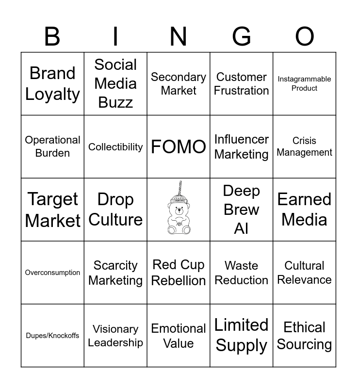 This bingo card has a free space and 25 words: Scarcity Marketing, Emotional Value, FOMO, Dupes/Knockoffs, Instagrammable Product, Brand Loyalty, Operational Burden, Social Media Buzz, Deep Brew AI, Red Cup Rebellion, Influencer Marketing, Target Market, Waste Reduction, Cultural Relevance, Collectibility, Servant Leadership, Earned Media, Secondary Market, Crisis Management, Drop Culture, Ethical Sourcing, Visionary Leadership, Overconsumption, Customer Frustration and Limited Supply.