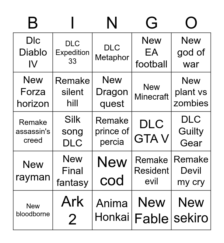 This bingo card has a free space and 24 words: New bloodborne, New Final fantasy, New Dragon quest, New Fable, New god of war, Dlc Diablo IV, DLC Expedition 33, DLC Metaphor, DLC GTA V, DLC Guilty Gear, Remake assassin's creed, Remake silent hill, Remake Resident evil, Remake Devil my cry, New Forza horizon, Ark 2, Anima Honkai, New EA football, New plant vs zombies, New rayman, Silk song DLC, New cod, New Minecraft and New sekiro.