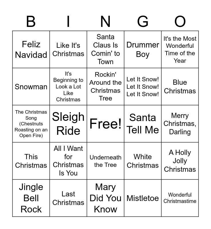 This bingo card has a free space and 24 words: All I Want for Christmas Is You, Last Christmas, Rockin' Around the Christmas Tree, Jingle Bell Rock, It's the Most Wonderful Time of the Year, Feliz Navidad, Snowman, Like It's Christmas, Santa Tell Me, Underneath the Tree, Let It Snow! Let It Snow! Let It Snow!, The Christmas Song (Chestnuts Roasting on an Open Fire), White Christmas, A Holly Jolly Christmas, It's Beginning to Look a Lot Like Christmas, Mistletoe, Merry Christmas, Darling, Santa Claus Is Comin' to Town, Blue Christmas, Sleigh Ride, Wonderful Christmastime, This Christmas, Drummer Boy and Mary Did You Know.