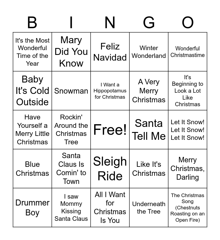 This bingo card has a free space and 31 words: All I Want for Christmas Is You, Last Christmas, Rockin' Around the Christmas Tree, Jingle Bell Rock, It's the Most Wonderful Time of the Year, Feliz Navidad, Snowman, Like It's Christmas, Santa Tell Me, Underneath the Tree, Let It Snow! Let It Snow! Let It Snow!, The Christmas Song (Chestnuts Roasting on an Open Fire), White Christmas, A Holly Jolly Christmas, It's Beginning to Look a Lot Like Christmas, Mistletoe, Merry Christmas, Darling, Santa Claus Is Comin' to Town, Blue Christmas, Sleigh Ride, Wonderful Christmastime, This Christmas, Drummer Boy, Mary Did You Know, A Very Merry Christmas, Baby It's Cold Outside, Winter Wonderland, Have Yourself a Merry Little Christmas, I saw Mommy Kissing Santa Claus, I Want a Hippopotamus for Christmas and Carol of the Bells.