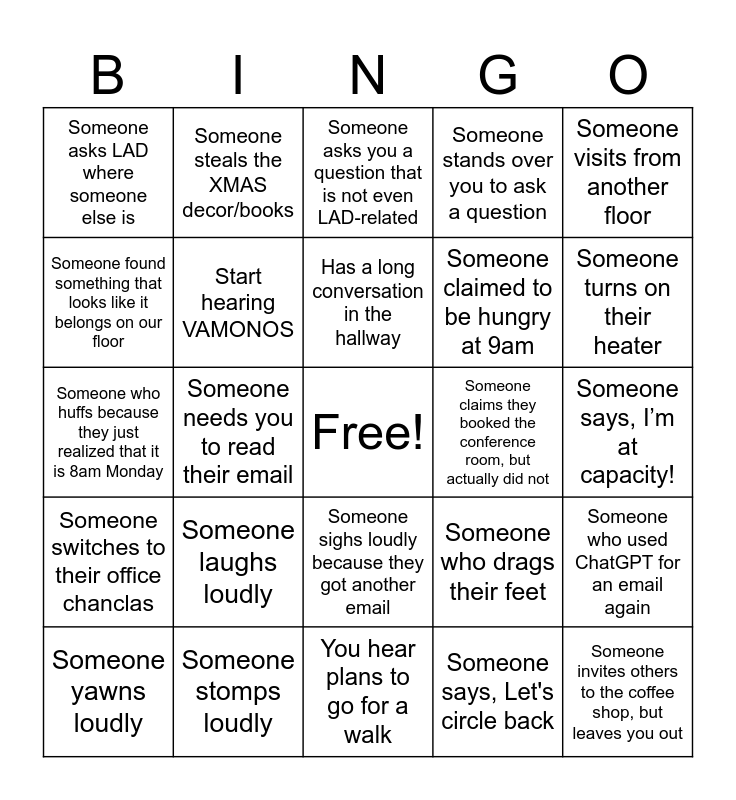 This bingo card has a free space and 24 words: Someone laughs loudly, Someone stomps loudly, Has a long conversation in the hallway, Someone yawns loudly, Someone visits from another floor, Someone asks LAD where someone else is, Someone found something that looks like it belongs on our floor, Someone steals the XMAS decor/books, Someone claims they booked the conference room, but actually did not, Someone sighs loudly because they got another email, Someone claimed to be hungry at 9am, Someone who huffs because they just realized that it is 8am Monday, Someone who drags their feet, Someone who used ChatGPT for an email again, Start hearing VAMONOS, Someone says, Let's circle back, Someone says, I’m at capacity!, Someone asks you a question that is not even LAD-related, Someone turns on their heater, Someone needs you to read their email, Someone invites others to the coffee shop, but leaves you out, Someone switches to their office chanclas, Someone stands over you to ask a question and You hear plans to go for a walk.