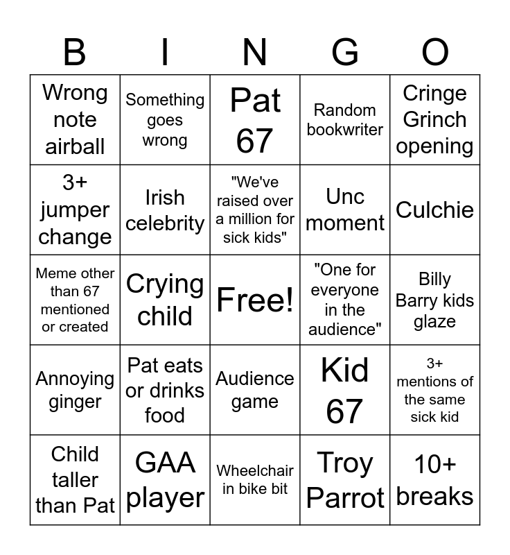 This bingo card has a free space and 24 words: Child taller than Pat, Pat eats or drinks food, "We've raised over a million for sick kids", Troy Parrot, Cringe Grinch opening, Wrong note airball, Something goes wrong, Pat 67, "One for everyone in the audience", Billy Barry kids glaze, Meme other than 67 mentioned or created, Irish celebrity, Kid 67, 3+ mentions of the same sick kid, 3+ jumper change, GAA player, Wheelchair in bike bit, Random bookwriter, Culchie, Annoying ginger, Crying child, Audience game, Unc moment and 10+ breaks.
