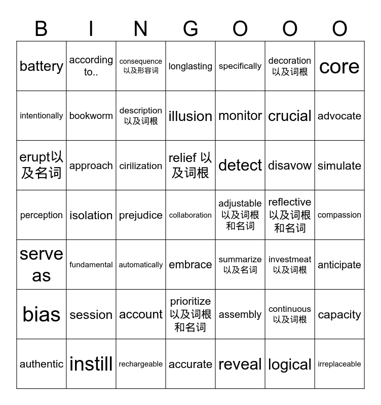 This bingo card has 66 words: charming, serve as, shed a single tear, disavow, adjustable 以及词根和名词, naive, according to.., strain, intentionally, rechargeable, relief 以及词根, continuous 以及词根, erupt以及名词, specifically, violently, decoration以及词根, monitor, battery, insufficient, bookworm, cirilization, approach, longlasting, automatically, collapse, anticipate, summarize 以及名词, turn out to be.., crucial, session, simulate, assembly, blurr, crisis, detect, perception, capacity, illusion, prejudice, bias, core, reflective 以及词根和名词, advocate, propose以及名词, accurate, embrace, description 以及词根, authentic, collaboration, compassion, reveal, empathy, irreplaceable, consistent, neutral, fundamental, contradict以及形容词, prioritize以及词根和名词, consequence以及形容词, isolation, investmeat以及词根, prerequisite, logical, instill, account and subsequent.