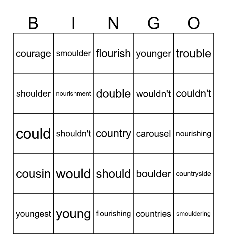 This bingo card has a free space and 24 words: would, young, double, youngest, trouble, courage, shoulder, smoulder, carousel, should, wouldn't, could, boulder, countryside, nourishment, countries, nourishing, flourish, couldn't, shouldn't, smouldering, cousin, younger and flourishing.
