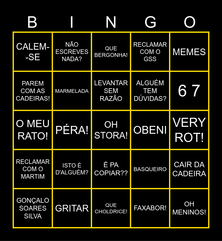 This bingo card has a free space and 24 words: ISTO É D'ALGUÉM?, GRITAR, LEVANTAR SEM RAZÃO, GONÇALO SOARES SILVA, MEMES, CALEM--SE, PAREM COM AS CADEIRAS!, NÃO ESCREVES NADA?, OBENI, É PA COPIAR??, ALGUÉM TEM DÚVIDAS?, O MEU RATO!, BASQUEIRO, CAIR DA CADEIRA, MARMELADA, FAXABOR!, VERY ROT!, QUE BERGONHA!, 6 7, PÉRA!, OH MENINOS!, RECLAMAR COM O MARTIM, RECLAMAR COM O GSS and QUE CHOLDRICE!.