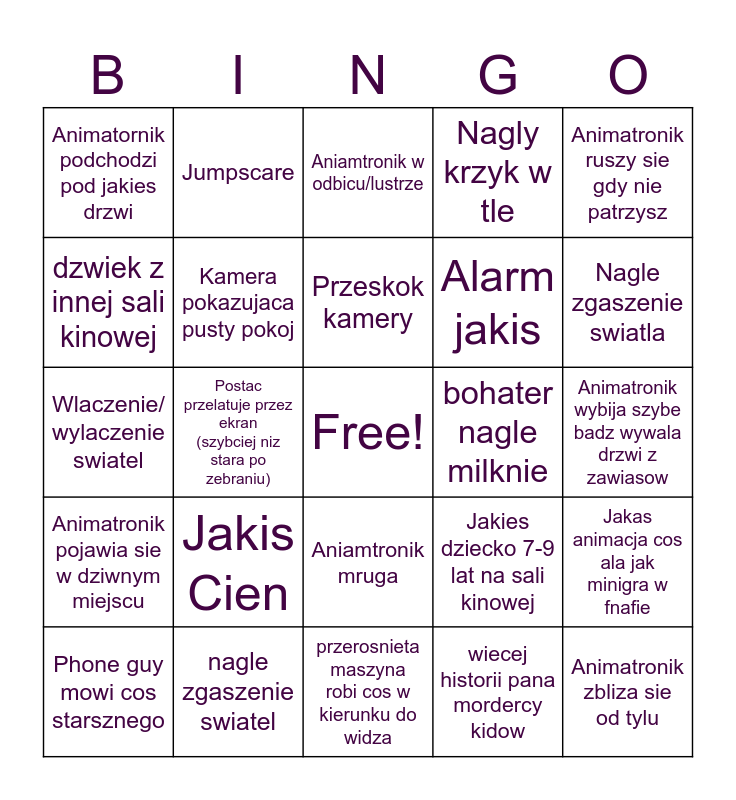 This bingo card has a free space and 24 words: Jakis Cien, nagle zgaszenie swiatel, Przeskok kamery, Phone guy mowi cos starsznego, Animatronik ruszy sie gdy nie patrzysz, Animatornik podchodzi pod jakies drzwi, dzwiek z innej sali kinowej, Jumpscare, bohater nagle milknie, Aniamtronik mruga, Alarm jakis, Wlaczenie/ wylaczenie swiatel, Jakies dziecko 7-9 lat na sali kinowej, Jakas animacja cos ala jak minigra w fnafie, Kamera pokazujaca pusty pokoj, wiecej historii pana mordercy kidow, Animatronik wybija szybe badz wywala drzwi z zawiasow, Aniamtronik w odbicu/lustrze, Nagle zgaszenie swiatla, Postac przelatuje przez ekran (szybciej niz stara po zebraniu), Animatronik zbliza sie od tylu, Animatronik pojawia sie w dziwnym miejscu, Nagly krzyk w tle and przerosnieta maszyna robi cos w kierunku do widza.