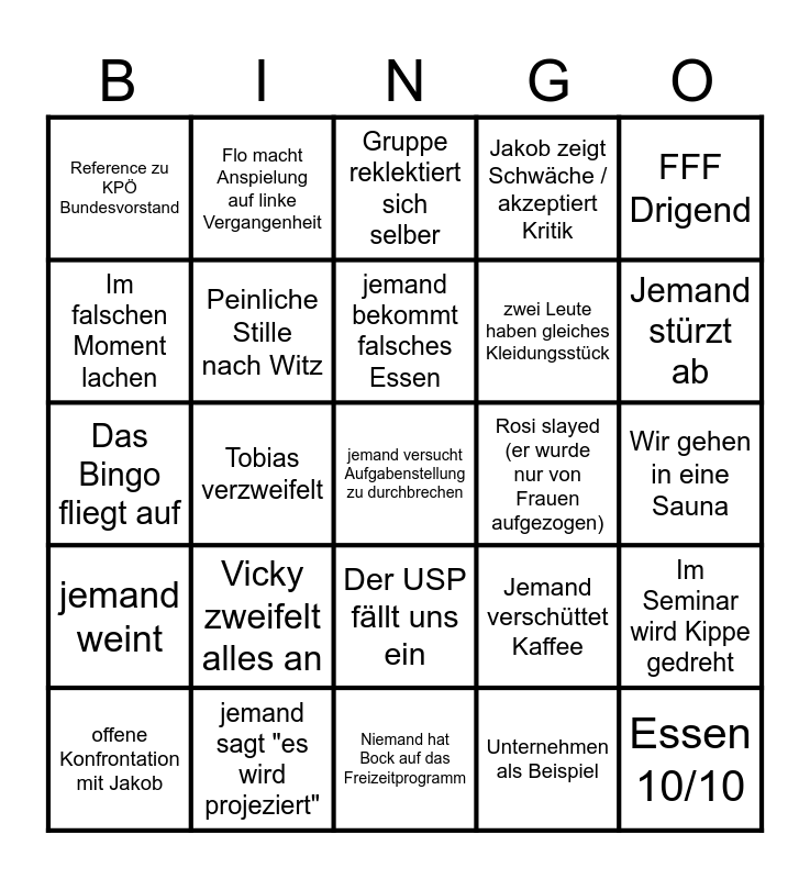 This bingo card has 25 words: jemand weint, jemand sagt "es wird projeziert", jemand versucht Aufgabenstellung zu durchbrechen, Unternehmen als Beispiel, FFF Drigend, Reference zu KPÖ Bundesvorstand, Flo macht Anspielung auf linke Vergangenheit, Gruppe reklektiert sich selber, Rosi slayed (er wurde nur von Frauen aufgezogen), Im Seminar wird Kippe gedreht, Im falschen Moment lachen, Peinliche Stille nach Witz, Niemand hat Bock auf das Freizeitprogramm, Jemand verschüttet Kaffee, Jemand stürzt ab, offene Konfrontation mit Jakob, Tobias verzweifelt, jemand bekommt falsches Essen, zwei Leute haben gleiches Kleidungsstück, Wir gehen in eine Sauna, Das Bingo fliegt auf, Vicky zweifelt alles an, Der USP fällt uns ein, Jakob zeigt Schwäche / akzeptiert Kritik and Essen 10/10.
