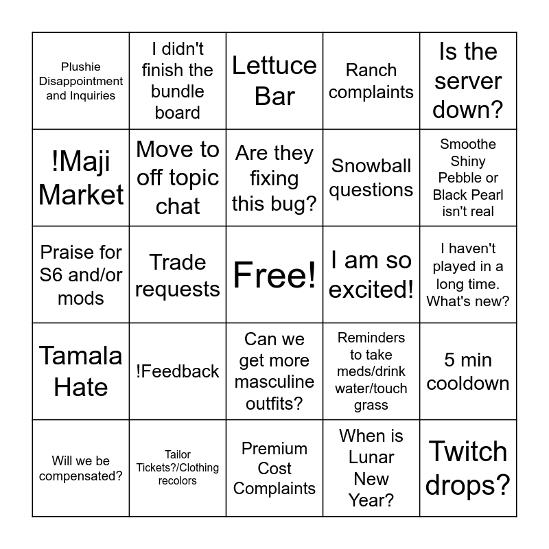 This bingo card has a free space and 25 words: !Feedback, Premium Cost Complaints, Are they fixing this bug?, Will we be compensated?, Is the server down?, Plushie Disappointment and Inquiries, !Maji Market, I didn't finish the bundle board, I am so excited!, Can we get more masculine outfits?, Snowball questions, Praise for S6 and/or mods, Reminders to take meds/drink water/touch grass, 5 min cooldown, Move to off topic chat, What am I supposed to do while the server is down?, I haven't played in a long time. What's new?, Lettuce Bar, Smoothe Shiny Pebble or Black Pearl isn't real, Trade requests, Twitch drops?, Tailor Tickets?/Clothing recolors, Tamala Hate, Ranch complaints and When is Lunar New Year?.