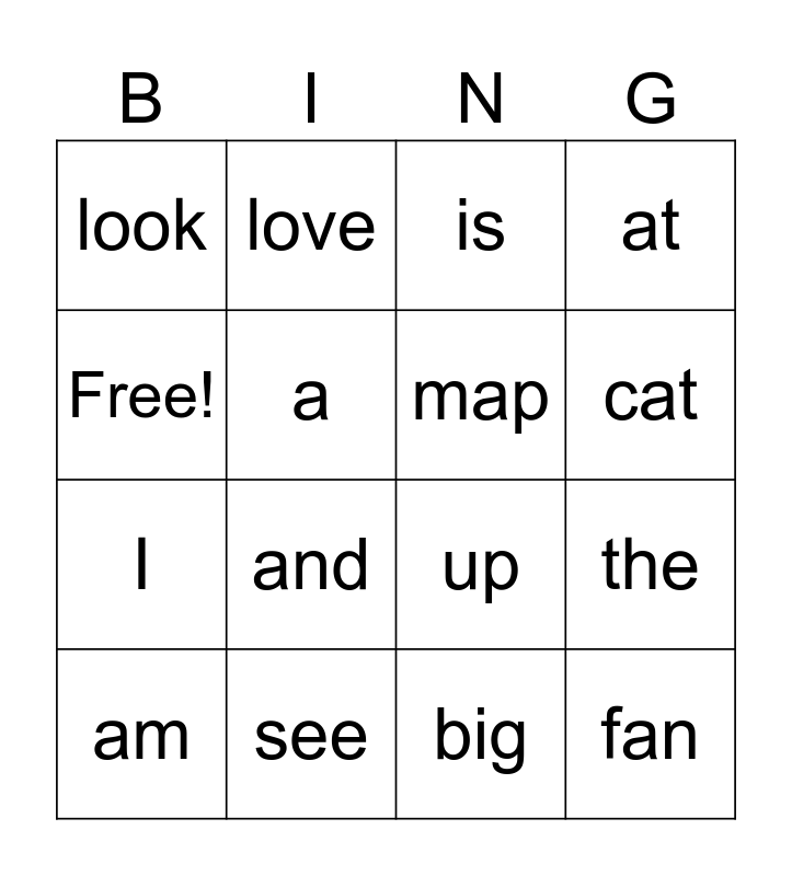 This bingo card has 16 words: see, the, is, look, I, love, up, big, Free!, a, am, at, and, cat, map and fan.