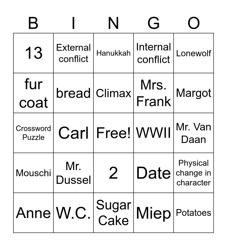 This bingo card has a free space and 29 words: Anne, Mr. Frank, Carl, Mr. Kraler, 13, Hanukkah, bread, Mr. Dussel, WWII, W.C., Mr. Van Daan, Potatoes, Sugar Cake, Miep, Margot, Cigarettes, 2, Mouschi, Lonewolf, Crossword Puzzle, Date, Flashback, Mrs. Frank, fur coat, Internal conflict, External conflict, Physical change in character, Climax and Rising Action Event.