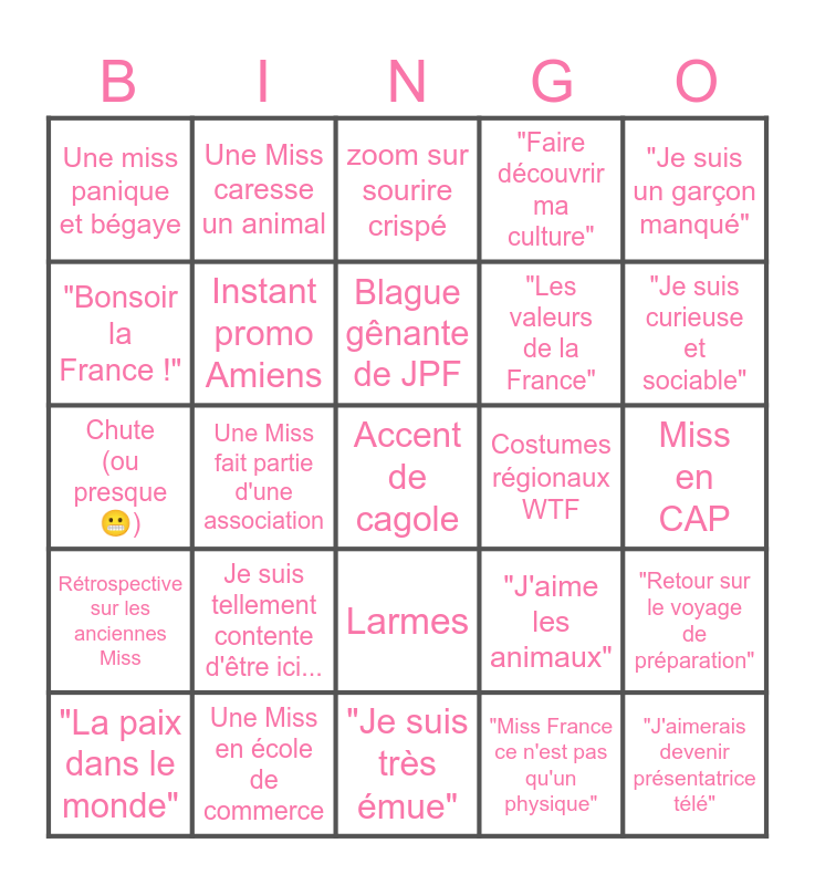 This bingo card has 40 words: “La bienveillance”, Chute (ou presque😬), "L'écologie c'est important", Instant promo Amiens, Une Miss en école de commerce, Larmes, Blague gênante de JPF, Citation, "Je suis un garçon manqué", Rétrospective sur les anciennes Miss, Une Miss fait partie d'une association, "Faire découvrir ma culture", Accent de cagole, Miss en CAP, Costumes régionaux WTF, Je suis tellement contente d'être ici..., "Rêve de petite fille", Une miss panique et bégaye, "Je souhaite porter haut les couleurs de ma région", zoom sur sourire crispé, "Retour sur le voyage de préparation", "Miss France ce n'est pas qu'un physique", "Les valeurs de la France", "Bonsoir la France !", "J'aime voyager", Blague avec l'huissier, "Les votes sont très serrés", "Ça va pas être facile de choisir", "J'aimerais devenir présentatrice télé", Une Miss parle en patois régional, Chanson française remixée, "La paix dans le monde", JPF se déguise, "J'aime les animaux", "Je suis curieuse et sociable", "Je suis très émue", Clin d’œil caméra, Passionnée de mode, Une Miss caresse un animal and Chanson de Disney.