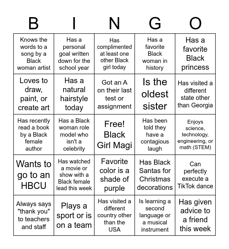 This bingo card has a free space and 24 words: Has watched a movie or show with a Black female lead this week, Plays a sport or is on a team, Got an A on their last test or assignment, Always says "thank you" to teachers and staff, Has a favorite Black princess, Knows the words to a song by a Black woman artist, Loves to draw, paint, or create art, Has a personal goal written down for the school year, Has been told they have a contagious laugh, Favorite color is a shade of purple, Is the oldest sister, Has recently read a book by a Black female author, Has Black Santas for Christmas decorations, Can perfectly execute a TikTok dance, Has a natural hairstyle today, Is learning a second language or a musical instrument, Enjoys science, technology, engineering, or math (STEM), Has complimented at least one other Black girl today, Has visited a different state other than Georgia, Has a Black woman role model who isn't a celebrity, Has given advice to a friend this week, Wants to go to an HBCU, Has a favorite Black woman in history and Has visited a different country other than the USA.