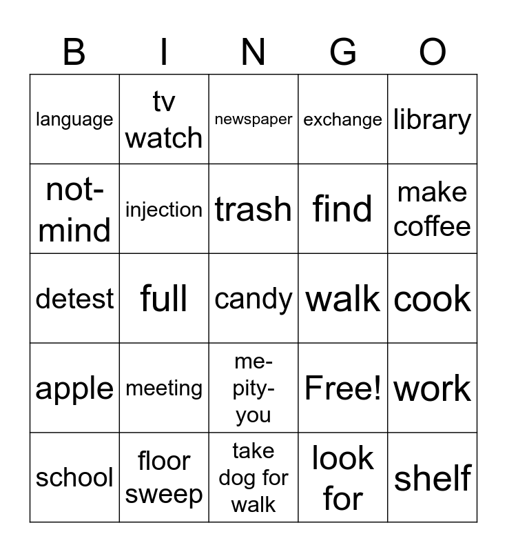 This bingo card has 25 words: meeting, take dog for walk, trash, school, library, language, not-mind, tv watch, walk, me-pity-you, find, detest, Free!, work, injection, shelf, cook, newspaper, make coffee, full, candy, floor sweep, apple, exchange and look for.